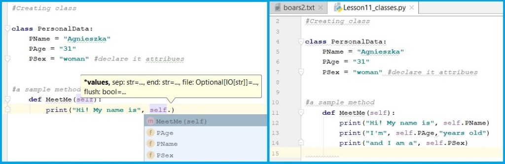 Analysing the example above most of us might think “what for I need classes if i have to declare something twice to use it? Time for example that will let us decide about the ressult of used parameters. Le’ts try again with one above: