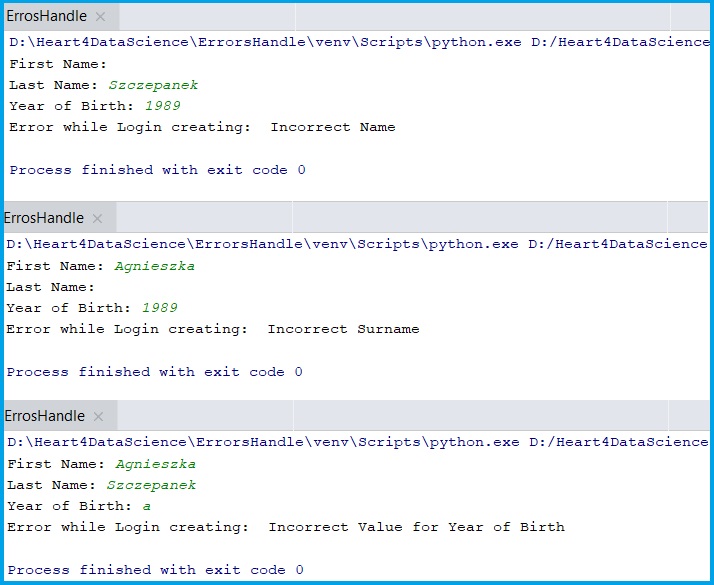 Inside we need to declare possible error that we might get while someone put wrong Name, Surname or Year: