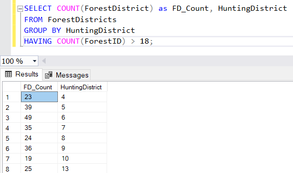 SELECT COUNT(ForestDistrict) as FD_Count, HuntingDistrict